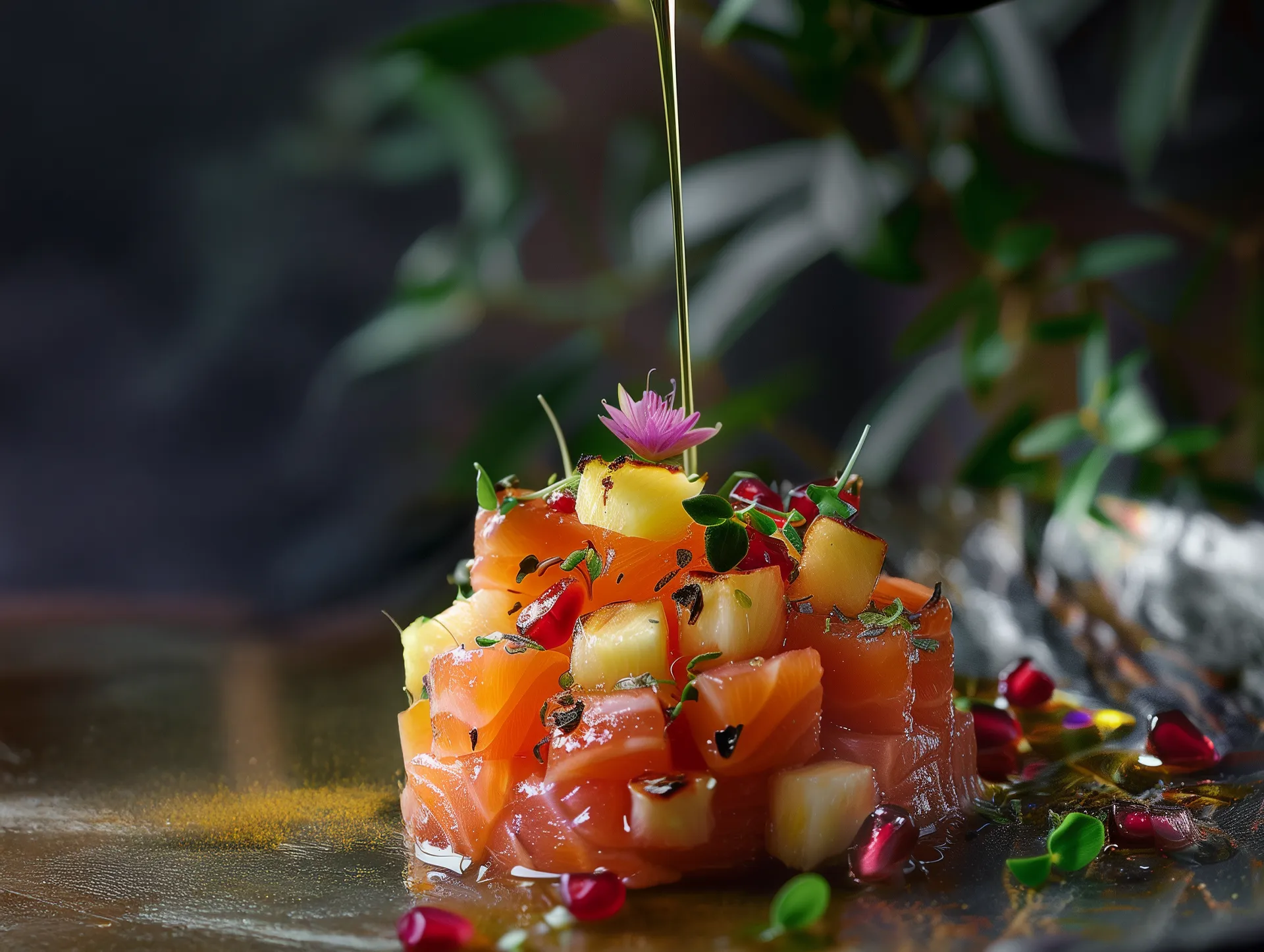 מניחים במרכז הצלחת כף גדושה של יוגורט חמוץ ומעליה את מיקס הטרטר, מפזרים מעל את אבקת הנורי, הצנוניות ועלי הכוסברה, סוגרים עם עוד נגיעה של שמן זית.