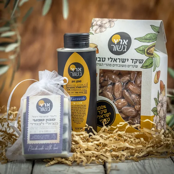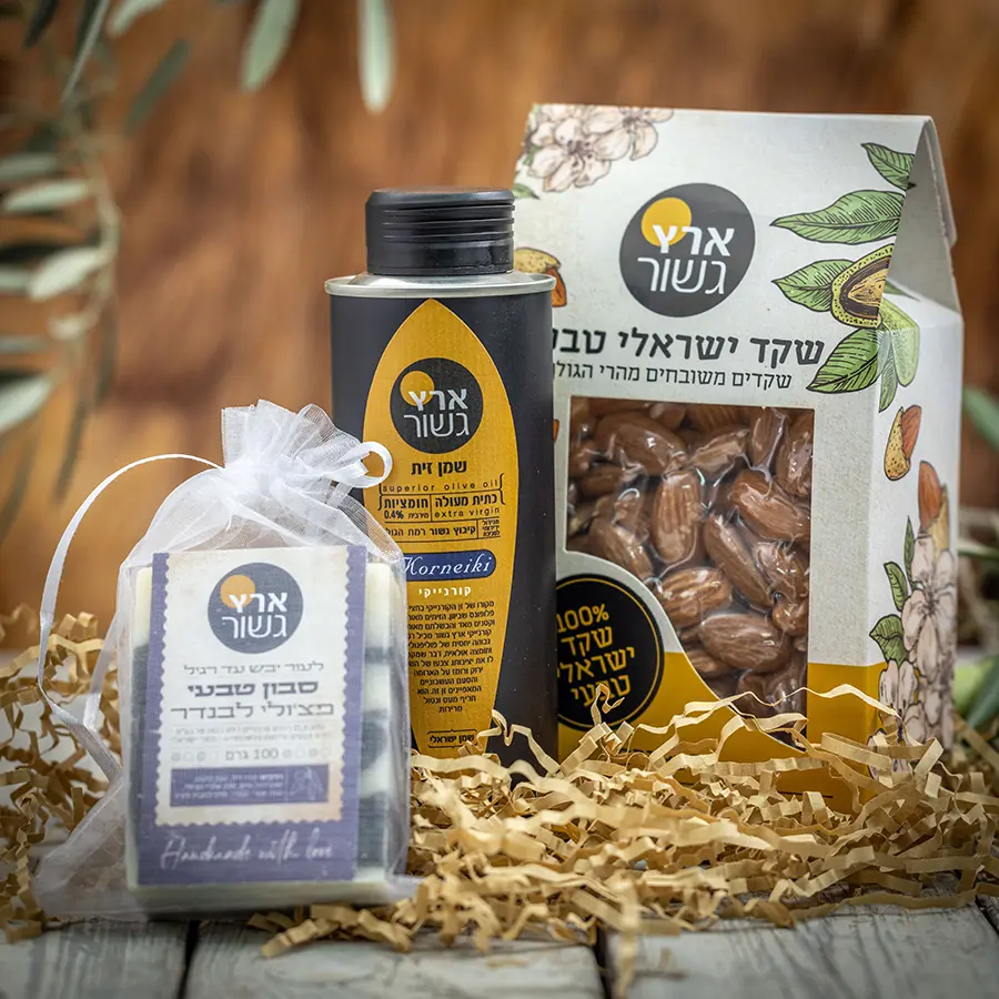 פח 250 מ"ל קורנייקי, 300 גרם שקדים וסבון מוצק.