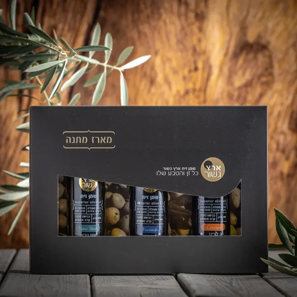 שלושה בקבוקי טעימה של 100 מ"ל המסודרים בקופסאת קרטון מהודרת .